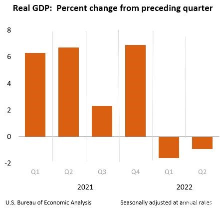 当地时间 7 月 28 日,美国商务部发布的数据显示,美国第二季度实际 GDP 年化季环比初值 -0.9%,预期 0.4%,前值 -1.6%。该数据在今年第一季度录得下降 1.6%,意味着,美国 GDP 已经连续两个季度录得负值,符合“技术性衰退”的标准定义。