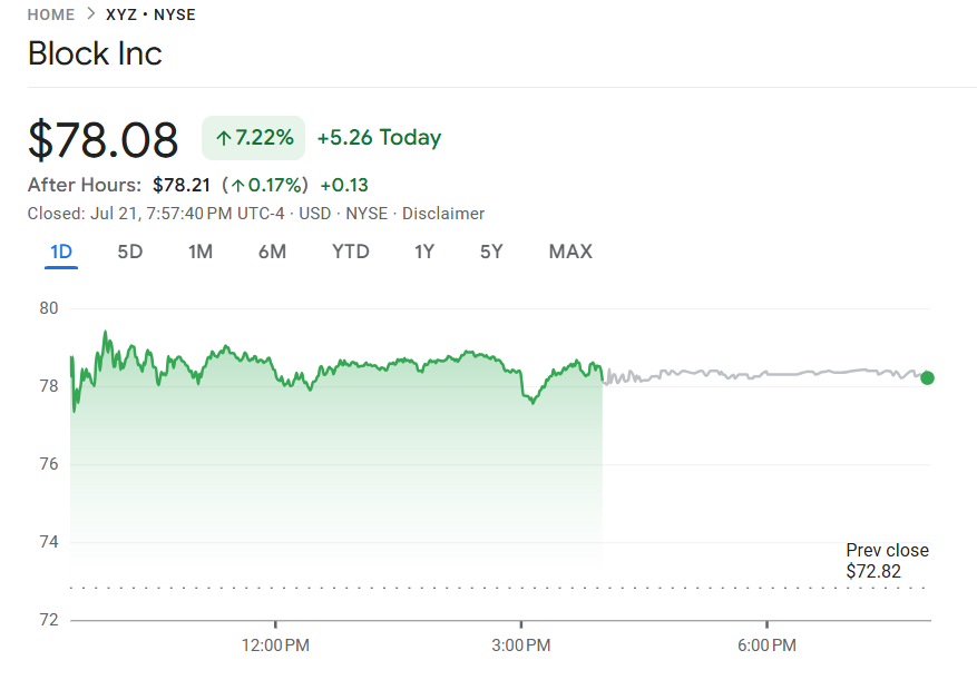 7 月 21 日,支付平台公司 Block(XYZ)周一股价强势上涨5.26美元,涨幅达7.22%,连续四个交易日收红,收盘价为 78.08 美元,创下自 2 月 20 日以来五个月的新高。当天成交额激增至 38.57 亿美元。