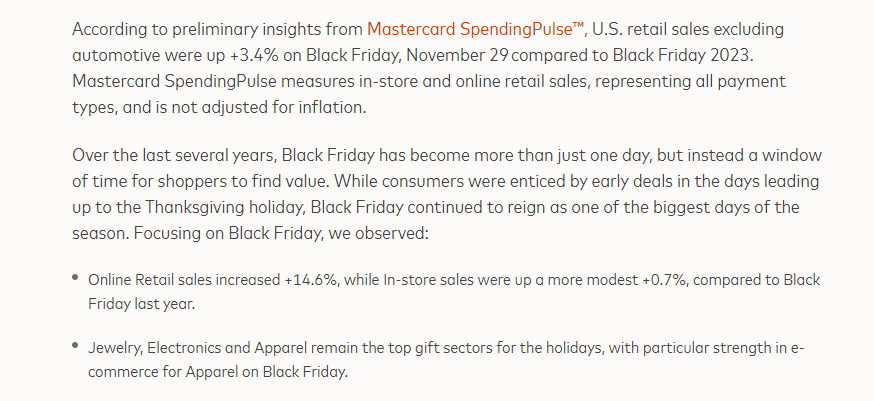 Facteus 则表示,截至上周五,包括 Shein、Temu 和 TikTok Shop 在内的电子商务零售商销售额与去年同期相比都呈现出强劲增长的走势。电商平台 Shopify 也报告称,其黑五当天的销售额创下新高,全球销售额达到 50 亿美元。其中,美国购物者的平均购物车消费额为 157 美元,大部分加购的商品为衣物、护肤品和维生素等。