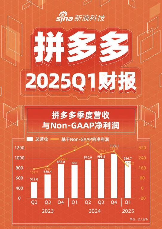 同日,拼多多公布 2025 年第一季度财报,营收 956.7 亿元人民币,同比增长 10%;净利润 147.42 亿元,同比下跌 47%,调整后净利润 169.2 亿元人民币,远不及预期的 278.8 亿元人民币;运营利润下降38%;营销费用激增 43%,拖累整体盈利。