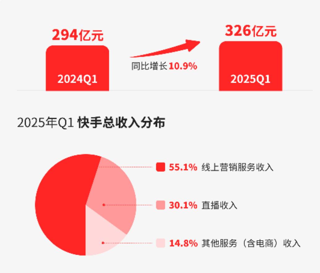 快手也发布了 2025 年第一季度业绩,总营收同比增长 10.9% 至 326 亿元。经调整净利润达 46 亿元,经调整净利润率为 14%,主营三项业务均实现增长: