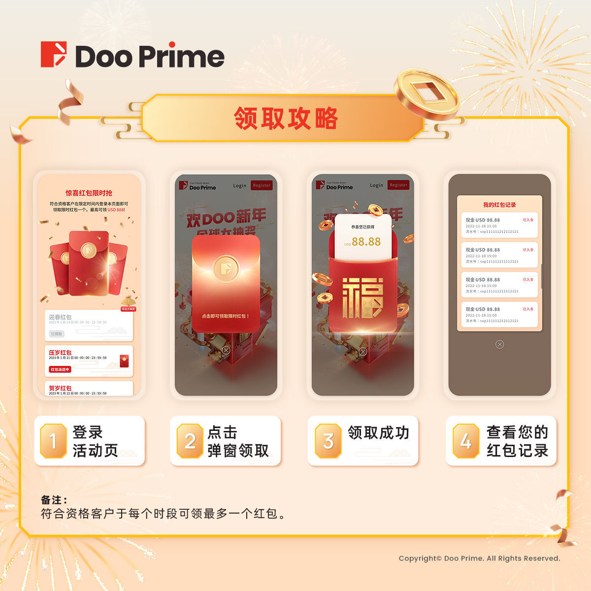 本次活动的日期将会横跨整个新春佳节,希望 Doo Prime 精心准备的开年全球大抽奖能够将一年的好运送给每位客户,还有许多现金红包和豪礼等着您领取,抓紧机会,万勿错过!