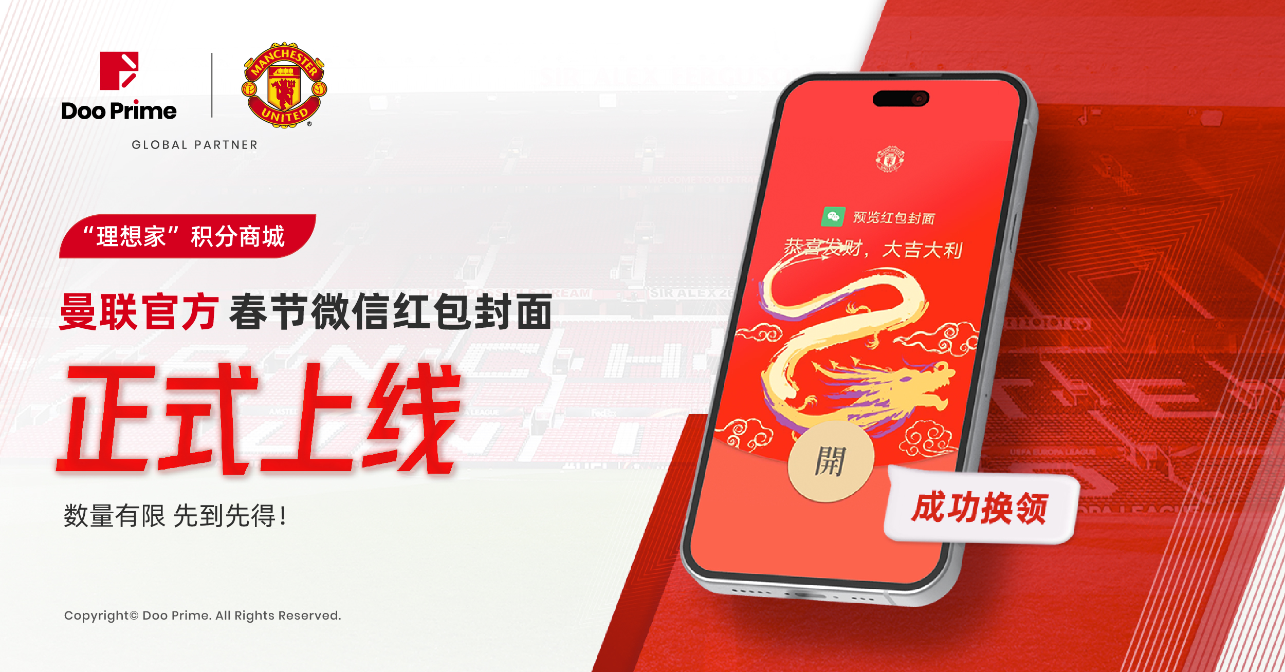 春节福利源源不断!Doo Prime “理想家” 积分商城既为客户提供了丰富多样的新春豪礼外,又一限定福利来袭:即日起,上线曼联官方2024 新春限定微信红包封面!作为曼联官方合作伙伴,Doo Prime 携手曼联为广大客户送上这份特别的新年礼物,以此祝福广大客户新年财源滚滚,交易满盈。