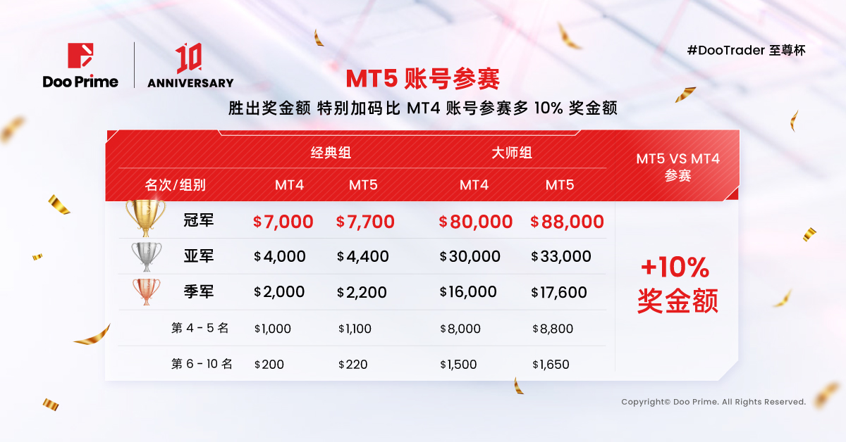 Doo Prime 今年将迎来十周年的辉煌历程,为欢庆这一里程碑,我们特别推出 #DooTrader 至尊杯十周年慈善交易大赛,不仅经典组与大师组各增设 5 个奖项(第 6 名至第 10 名),更令人期待的是,相比往期的比赛, #DooTrader 至尊杯的奖金额持续攀升,经典组冠军奖金从 3,500 美元提高到 7,000 美元,大师组冠军奖金从 40, 000 美元翻倍至 80,000 美元,总奖金池高达 182,000 美元,等待您来一决高下!