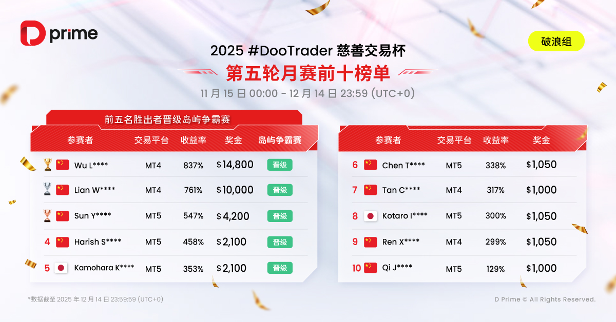 2025 年 D Prime #DooTrader 慈善交易杯第五轮月赛已于 12 月 14 日 23:59(UTC+0)顺利收官,赛果榜单火热揭晓!第六轮月赛紧随于 2025 年 12 月 15 日 00:00(UTC+0)开赛 —— 欢迎各路交易高手立刻报名,争夺最后轮月赛破浪组 TOP5 晋级线下岛屿争霸赛名额!