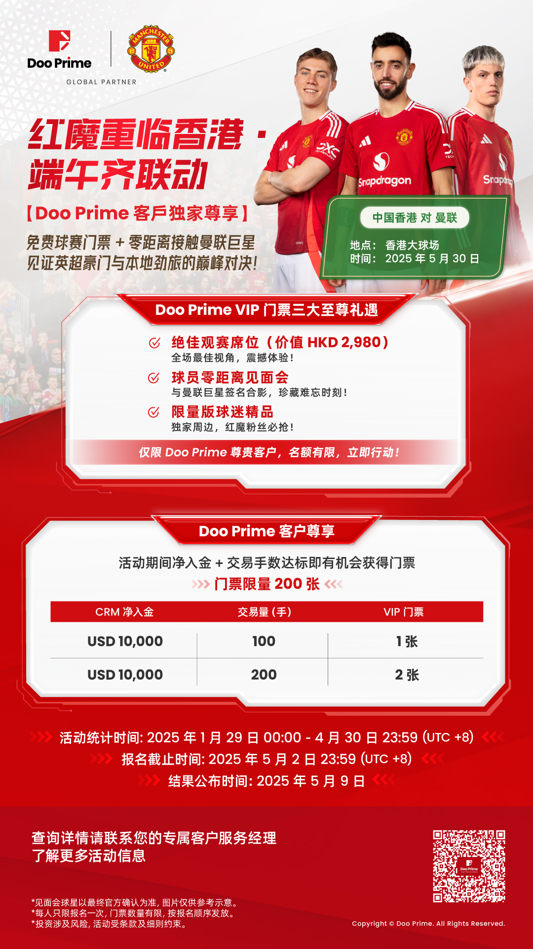 当英超红魔遇上东方端午,注定碰撞出激情火花!值此 Doo Prime 与曼联合作三周年之际,为感恩客户与球迷的热爱,曼联现役球星将于 5 月 30 日重临香港,在香港举办超燃粉丝见面会!恰逢端午佳节,Doo Prime 特别推出 「限定门票+球场观赛」双重福利,邀您与红魔零距离互动,共度热血端午!