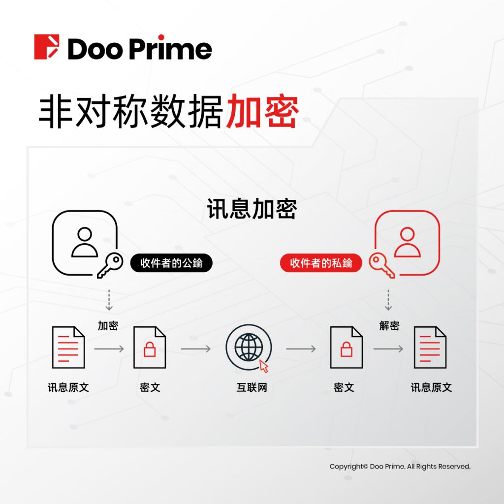 Doo Prime 采用的 SSL 加密技术属于非对称加密。非对称加密较对称加密多了“公共密钥”和“私私密钥”的概念,公钥用于加密外传信息,私钥用于解开信息内容,用接收人的公钥加密的数据只能用相应的私钥解密 。