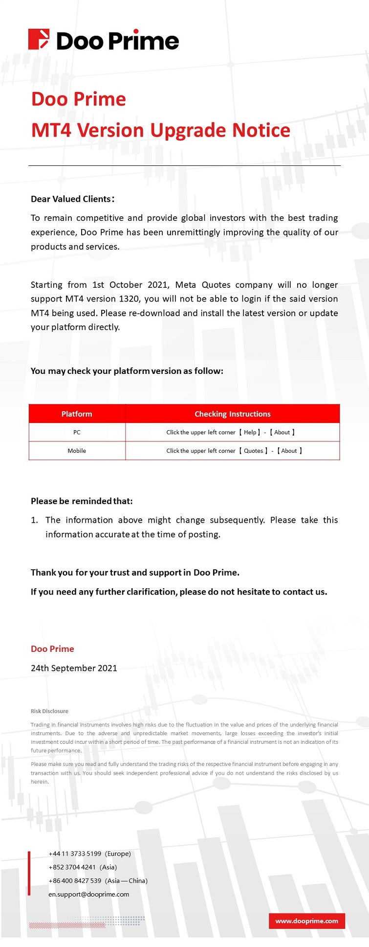 Doo Prime MT4 Version Update Notice