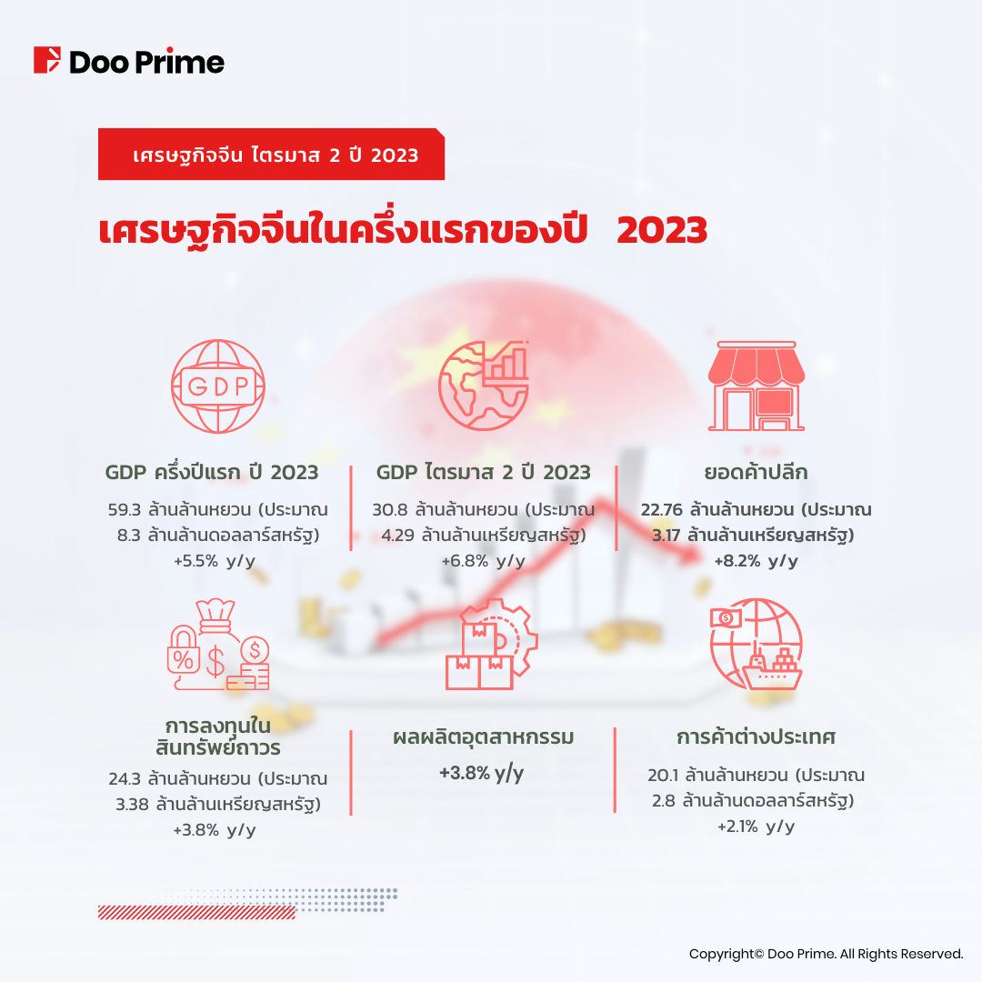 - GDP ไตรมาสที่ 2 ของปี 2023: 30.8 ล้านล้านหยวน (ประมาณ 4.29 ล้านล้านเหรียญสหรัฐ) +6.8% y/y