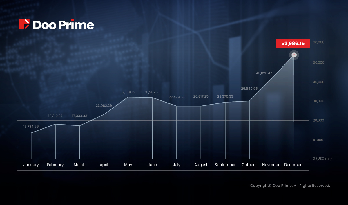 ในขณะเดียวกัน ปริมาณการซื้อขายเฉลี่ยต่อวัน (ADV) ในเดือนธันวาคม 2564 ที่ผ่านมานั้นอยู่ที่ 1,740,000,000 พันล้านดอลลาร์สหรัฐ ซึ่งเพิ่มขึ้น 19.22% เมื่อเทียบกับเดือนพฤศจิกายน โดยปริมาณซื้อขายสะสมทั้งหมดของ Doo Prime จนถึงปัจจุบันมีมูลค่ารวมเป็น 347.93 พันล้านดอลลาร์