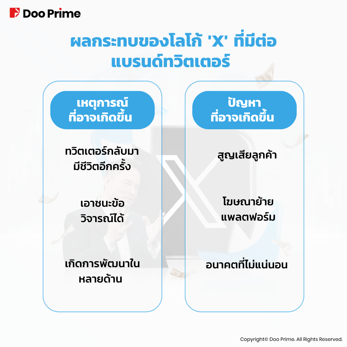 อย่างไรก็ตาม การรีแบรนด์อาจเป็นดาบสองคม และผลกระทบจากการเปลี่ยนโลโก้ทวิตเตอร์ของอีลอนนั้นเป็นทั้งข้อดีและข้อเสียอย่างไม่ต้องสงสัย การเปลี่ยนแปลงโลโก้ “X” อาจเติมชีวิตใหม่ให้กับ Twitter ซึ่งทำให้สามารถเริ่มต้นใหม่ด้วยภาพลักษณ์ใหม่ๆและอาจจะมีโอกาสในการพัฒนาเพิ่มเติม