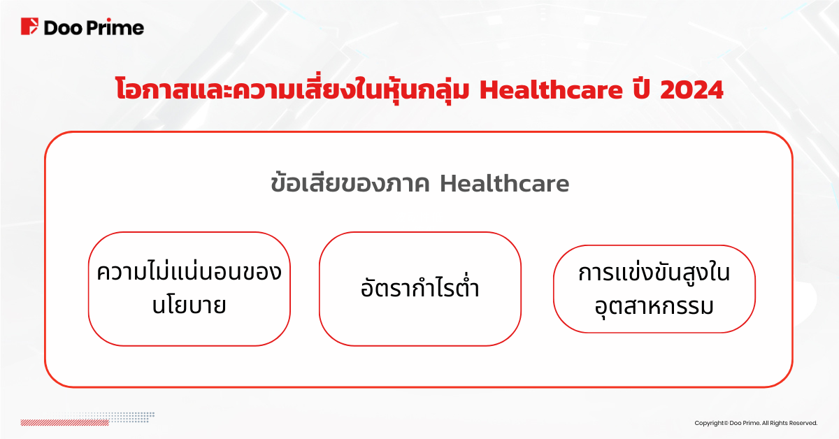 • การแข่งขันสูงภายในอุตสาหกรรม การเข้ามาของบริษัทเทคโนโลยีในภาค Healthcare มากขึ้น รวมถึงบริษัทยักษ์ใหญ่อย่าง Google และ Microsoft มีศักยภาพที่จะเปลี่ยนแปลงรูปแบบธุรกิจที่มีอยู่อย่างมีนัยสำคัญ นอกจากนี้ บริษัทเทคโนโลยีชีวภาพที่มีนวัตกรรมอาจมีประสิทธิภาพเหนือกว่าบริษัทยาขนาดใหญ่แบบดั้งเดิม การไหลเข้าของผู้เข้าร่วมรายใหม่ในอุตสาหกรรมการดูแลสุขภาพอาจปรับเปลี่ยนการจัดอันดับหุ้นด้านการดูแลสุขภาพที่มีอยู่ ส่งผลให้การแข่งขันรุนแรงขึ้นภายในภาคส่วนนี้