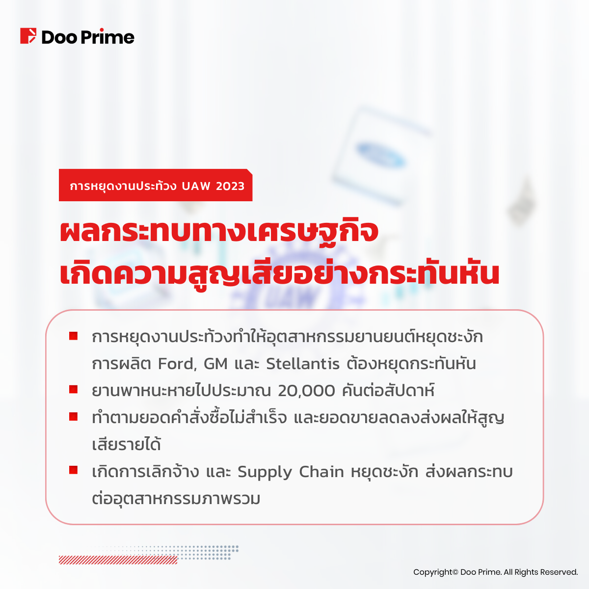 การหยุดงานประท้วงของ UAW ซึ่งครอบคลุมทั้ง Ford, GM และ Stellantis ได้ส่งผลให้อุตสาหกรรมยานยนต์ตกอยู่ในภาวะเปลี่ยนแปลงครั้งใหญ่ แม้ว่าผลกระทบทางเศรษฐกิจที่เกิดขึ้นในทันทีจะไม่รุนแรงมากนัก แต่ก็ไม่สามารถประเมินความเป็นไปได้ที่จะเกิดการลุกลามและการหยุดชะงักของห่วงโซ่อุปทานได้