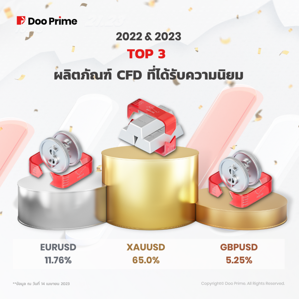 ตลอดปี 2022 และไตรมาสแรกของปี 2023 ผลิตภัณฑ์ที่ได้รับความนิยมมากที่สุดสำหรับแคมเปญการเทรดแบบ Swap-Free ได้แก่ ผลิตภัณฑ์ XAUUSD, EURUSD และ GBPUSD ซึ่งคิดเป็น 65%, 11.76% และ 5.25% ตามลำดับ ซึ่งผลิตภัณฑ์เหล่านี้อยู่ในแคมเปญเทรดแบบ Swap-Free ซึ่งช่วยลูกค้าให้ประหยัดได้อย่างมาก