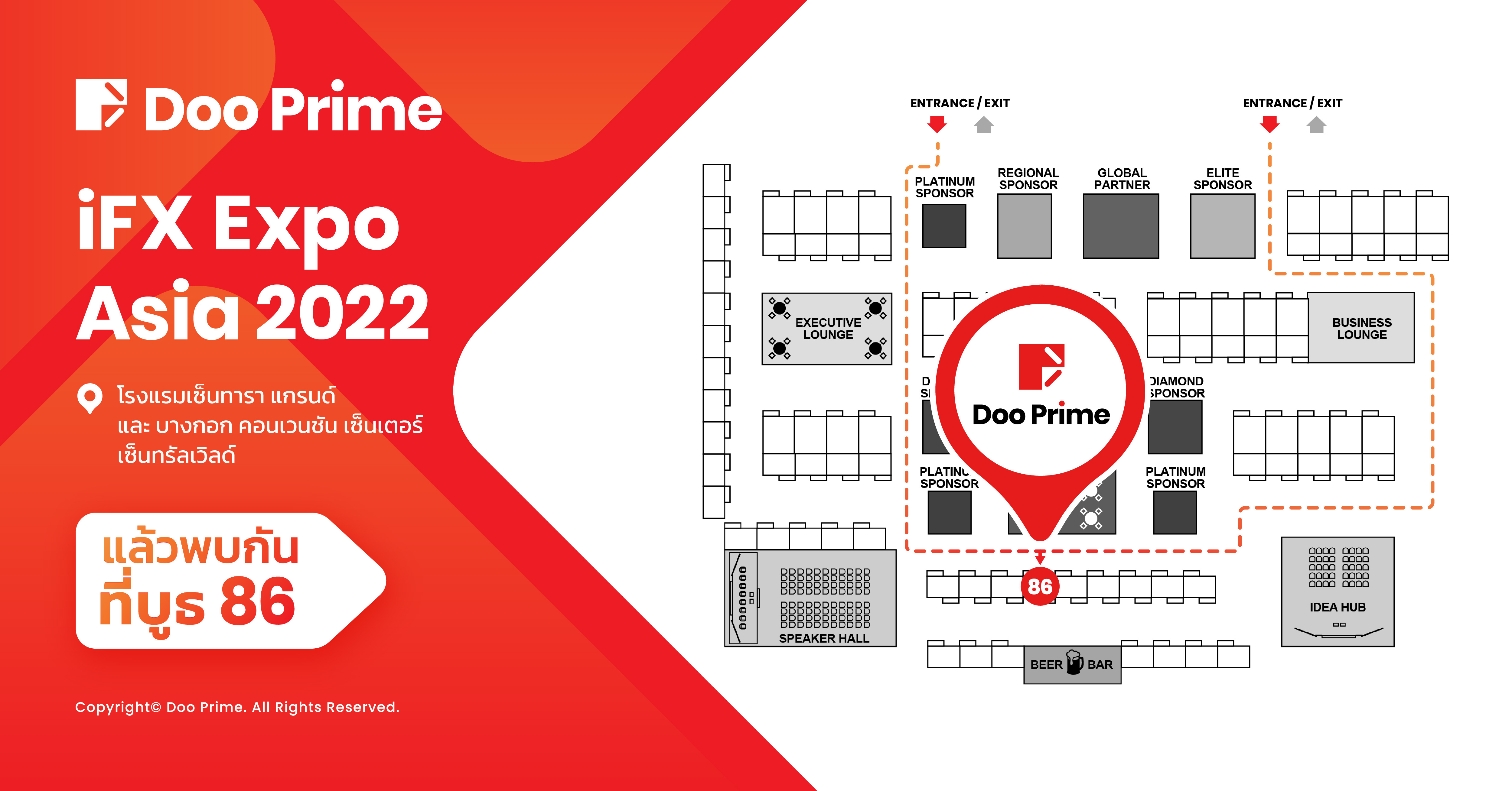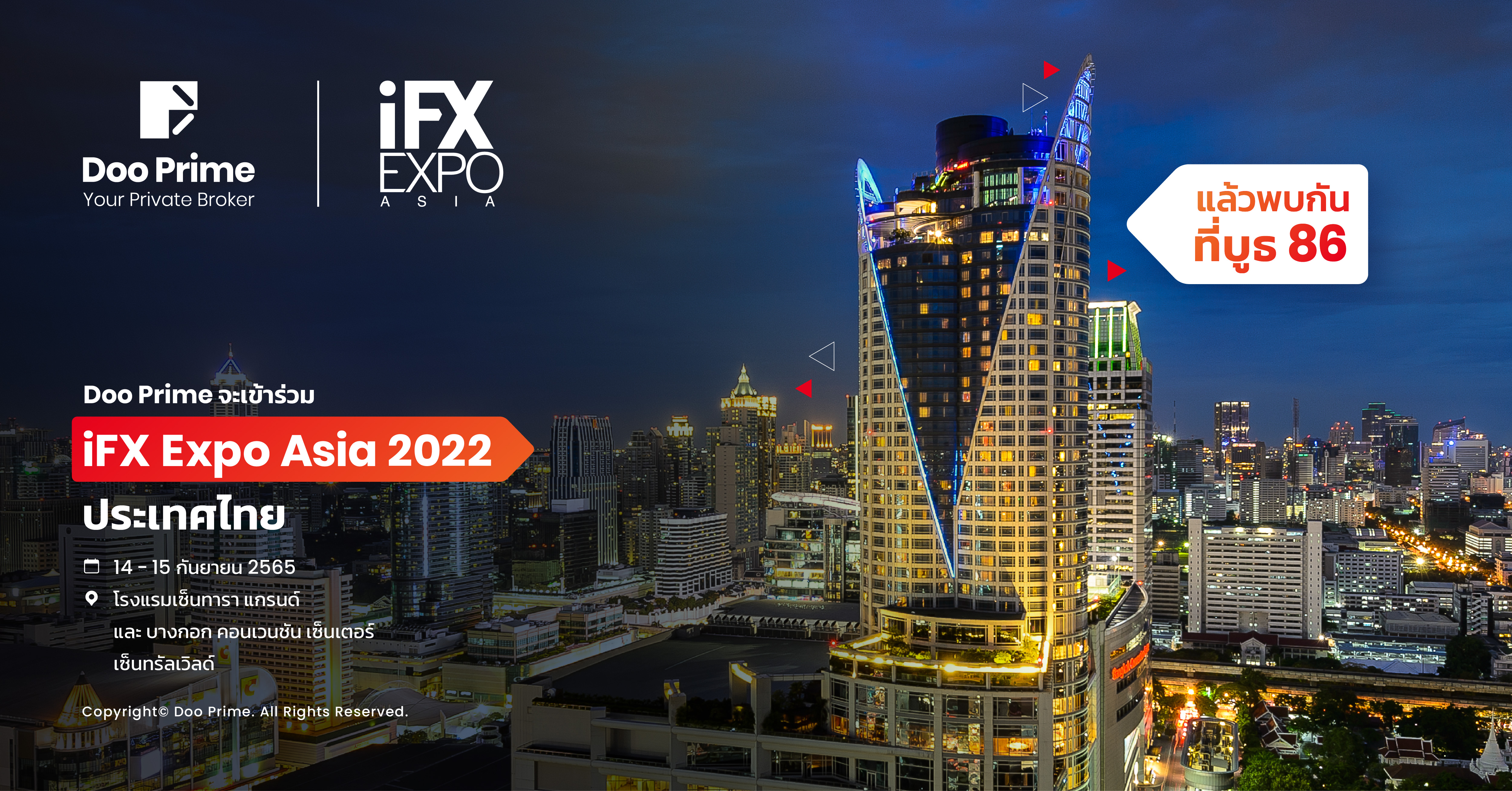บริษัทเทคโนโลยีการเงินชั้นนำของโลกอย่าง Dooprime ยินดีเป็นอย่างยิ่งที่จะประกาศให้ทราบว่าทางเราจะเข้าร่วมงาน IFX Expo Asia 2022 งานประชุม B2B(Business-to-Business) ที่ใหญ่ที่สุดโดยจะจัดในวันที่ 14 กันยายน 2565 ถึง วันที่ 15 กันยายน 2565 ณ เซ็นทาราแกรนด์และบางกอกคอนเวนชันเซ็นเตอร์ที่เซ็นทรัลเวิลด์ กรุงเทพมหานครที่ประเทศไทย