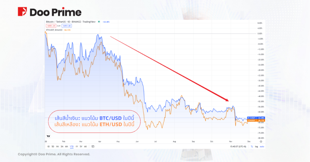 ในเดือนพฤศจิกายนปีนี้ FTX บริษัทระดับโลกที่ให้บริการซื้อขายคริปโตฯ อันดับ 3 ได้ยื่นล้มละลาย ซึ่งเหตุการณ์ได้คล้ายกับการที่ Lehman ยักษ์ใหญ่การเงินของสหรัฐฯ เคยยื่นล้มละลายในช่วงวิกฤตแฮมเบอร์เกอร์ สิ่งนี้ทำให้ราคา Bitcoin, Ethereum และ เหรียญคริปโตอื่นๆ ร่วงลงทันที