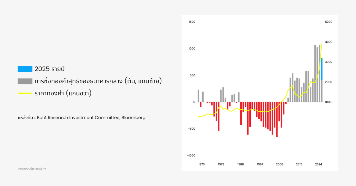 ธนาคารกลางทั่วโลกซื้อทองคำ 1,080 ตันในปี 2022, 1,051 ตันในปี 2023 และ 1,089 ตันในปี 2024 และในปี 2025 แนวโน้มยังคงต่อเนื่องเข้าสู่ ปีที่ 16 ติดต่อกันของการซื้อสุทธิ ซึ่งเป็นช่วงเวลาที่ยาวนานที่สุดเท่าที่เคยบันทึกไว้