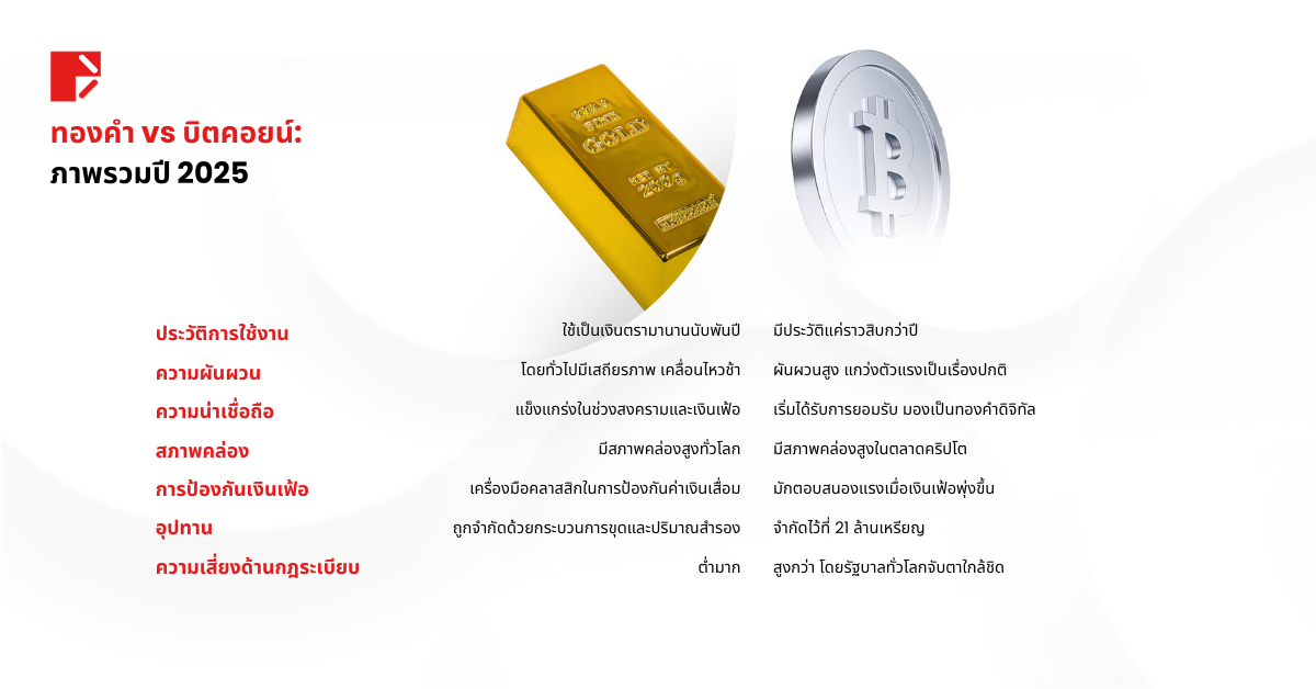 ก่อนจะลงลึกว่าอะไรเป็นตัวขับเคลื่อนตลาดของทั้งสองฝั่ง มาดูภาพรวมกันก่อนว่า ทองคำและบิตคอยน์แตกต่างกันอย่างไรในปัจจัยพื้นฐานที่นักลงทุนให้ความสำคัญมากที่สุดในตอนนี้