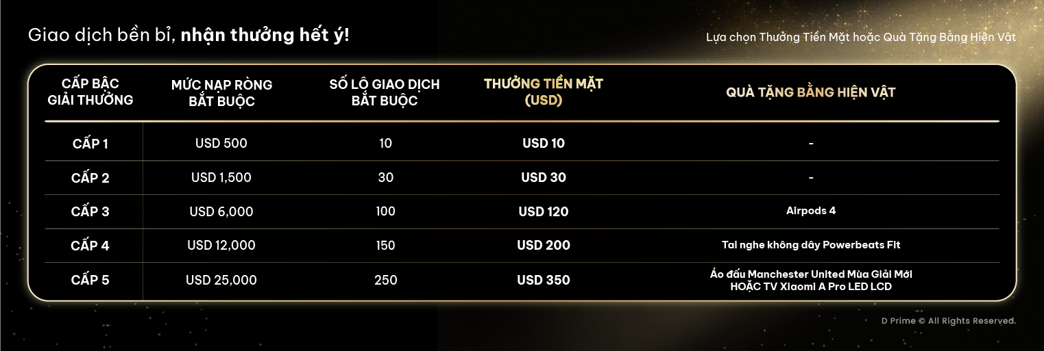Từ những bước chập chững đầu tiên đến vạch đích cuối cùng, mỗi lô giao dịch sẽ giúp bạn tiến gần hơn với chiến thắng chung cuộc. Ở ngay vạch đích, D Prime đã chuẩn bị sẵn cho bạn Thưởng Tiền Mặt lên đến $5,000 hoặc một phần thưởng giá trị tương ứng với hiệu suất mà bạn mang lại.