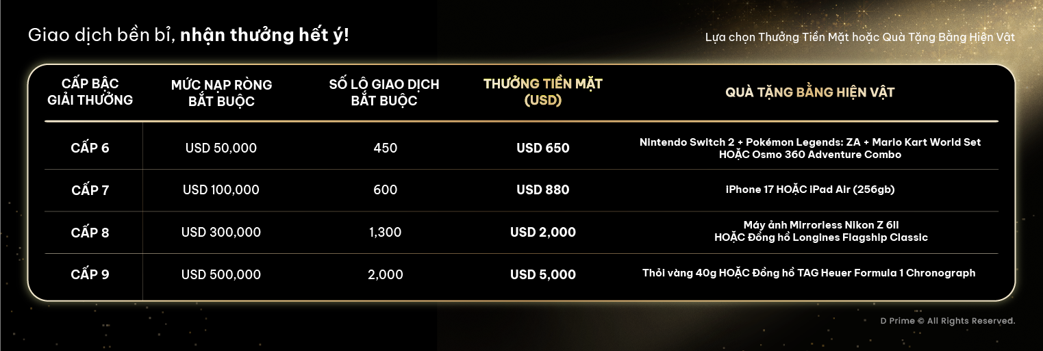 Đường đua lần này không chỉ có phần thưởng. Hơn hết, đường đua còn là một minh chứng sống động cho hành trình 11 năm mà D Prime đồng hành cùng quý nhà giao dịch. Trong suốt thời gian đó, bạn cùng nhiều nhà giao dịch khác đã biến từng chuyển động thành sự bứt phá và sự tham gia thành các bước tiến đáng nể.