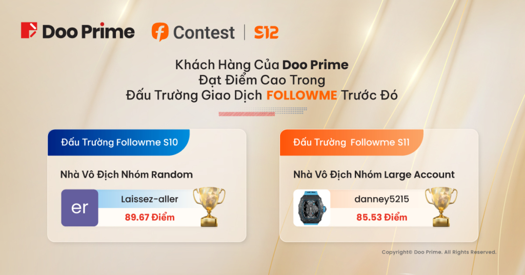 Với sự hỗ trợ từ phía Doo Prime, Đấu Trường Giao Dịch FOLLOWME S12 sẽ mang đến một môi trường phát triển sâu rộng hơn nhằm thể hiện sự đổi mới tài chính cùng các tiến bộ về công nghệ. Thông qua đó, chúng tôi mong muốn sẽ sớm chứng kiến những màn trình diễn đỉnh cao đến từ các “nghệ sỹ” đích thực trong cộng đồng giao dịch trên thế giới.