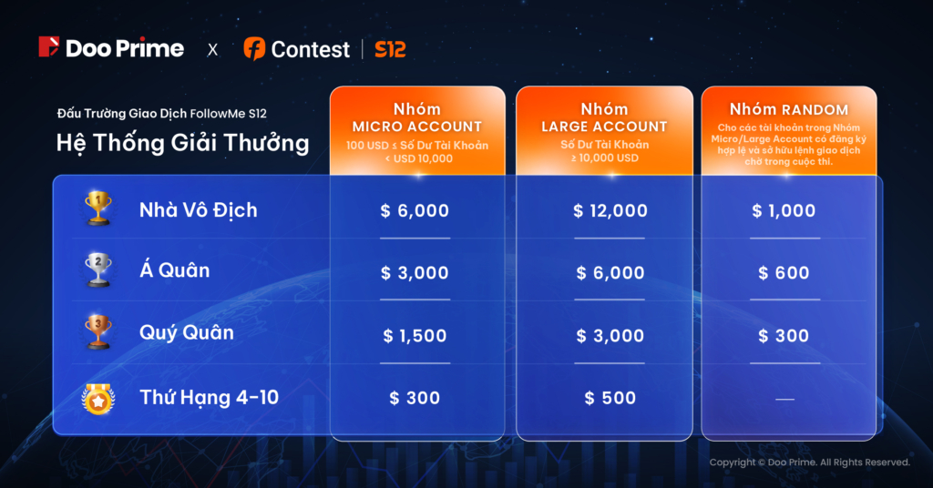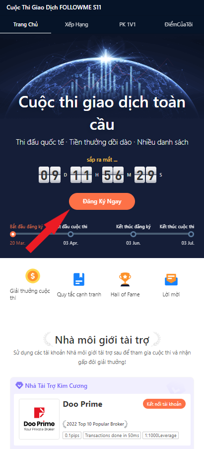 Đặc biệt, những người tạo tài khoản Doo Prime lần đầu thông qua nền tảng FOLLOWME ngay trong khuôn khổ Đấu Trường Giao Dịch FOLLOWME S12 sẽ có cơ hội giành được MacBook Pro, iPhone 14 Pro, iPad mini hoặc các giải thưởng kỹ thuật số 3C hấp dẫn bên cạnh tổng giải thưởng hơn 55,000 USD từ cuộc thi. Chúng tôi rất hy vọng được song hành cùng bạn trên hành trình giao dịch ngay cả trong và sau cuộc thi.