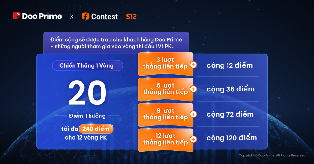 Giải đấu PK được chia ra làm 12 giai đoạn riêng biệt, với các đối thủ được sắp xếp để cạnh tranh trực tiếp trong từng giai đoạn một. Người chơi có thể tiến hành kiếm điểm thưởng thông qua việc tích luỹ qua các lần thắng hoặc chuỗi thắng điểm trong cuộc thi. Sau khi hoàn thành hết 12 giai đoạn, người chơi có thể tận dụng tổng điểm đã giành được để chia giải thưởng. Đối tượng tham gia sở hữu điểm cộng cũng sẽ được tặng thưởng nếu người chơi sử dụng tài khoản Nhà Tài Trợ Kim Cương để tham gia. Với sự hậu thuẫn từ phía Doo Prime, người tham gia có thể tận dụng tối đa ưu thế trong các môi trường giao dịch để giành chiến thắng cao nhất với giải thưởng “Grand Slam” cho giải đấu 12 vòng PK.