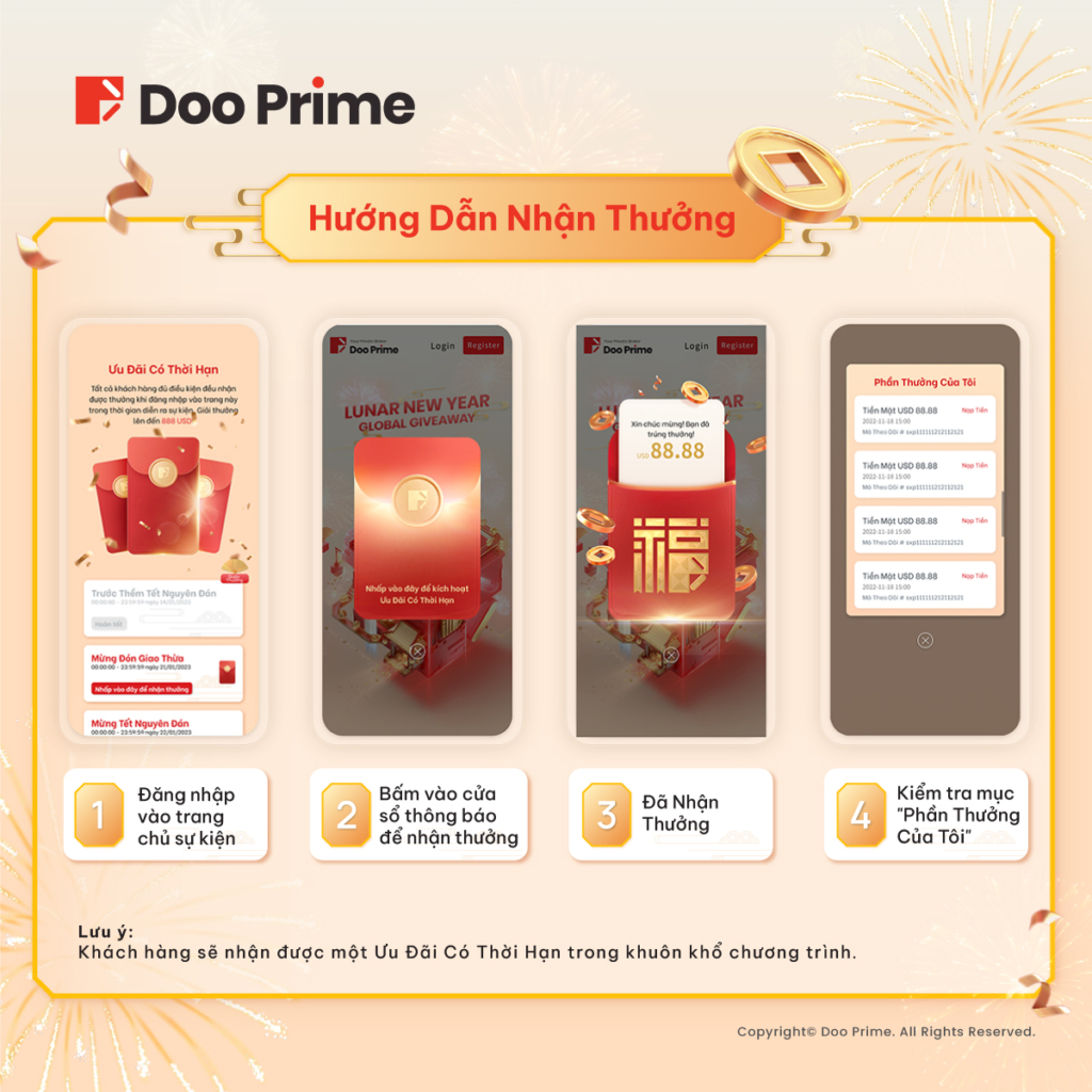 Trong năm 2022, Tập đoàn Doo Group đã ấp ủ chuỗi sự kiện tri ân khách hàng toàn cầu – những người đã lựa chọn ủng hộ và tin tưởng chúng tôi trong suốt thời gian qua. Năm 2023 sẽ là thời điểm mà chúng tôi cho ra mắt hàng loạt các chiến dịch cùng chương trình ưu đãi hấp dẫn cho các nhà đầu tư trên toàn thế giới. Cụ thể, trong năm Quý Mão, Doo Prime sẽ chính thức khởi động chương trình “Giveaway Toàn Cầu Nhân Dịp Tết Nguyên Đán” và nhiều ưu đãi có thời hạn, như một lời chúc năm mới đến quý khách hàng.