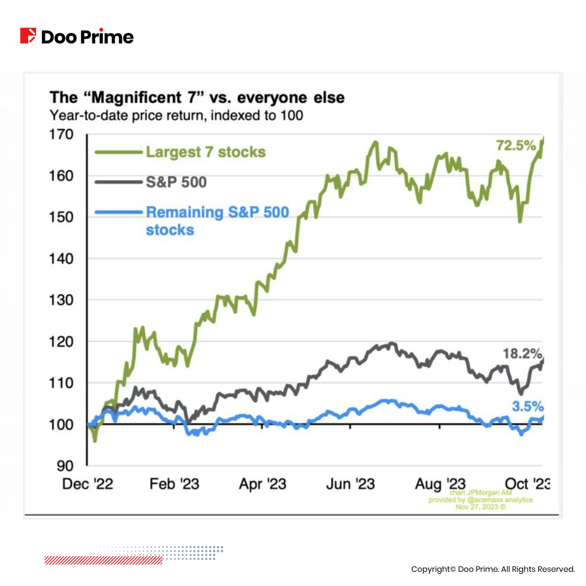 7 cổ phiếu lớn nhất sàn chứng khoán Mỹ đang tăng cao. Cũng chính nhờ “Magnificent 7”, cụ thể bao gồm Apple (AAPL), Alphabet (GOOGL, GOOG), Microsoft (MSFT), Amazon (AMZN), Meta (META), Nvidia (NVDA) và Tesla (TSLA), làm động lực chính thúc đẩy thị trường chứng khoán Mỹ đạt đến đỉnh mới.
