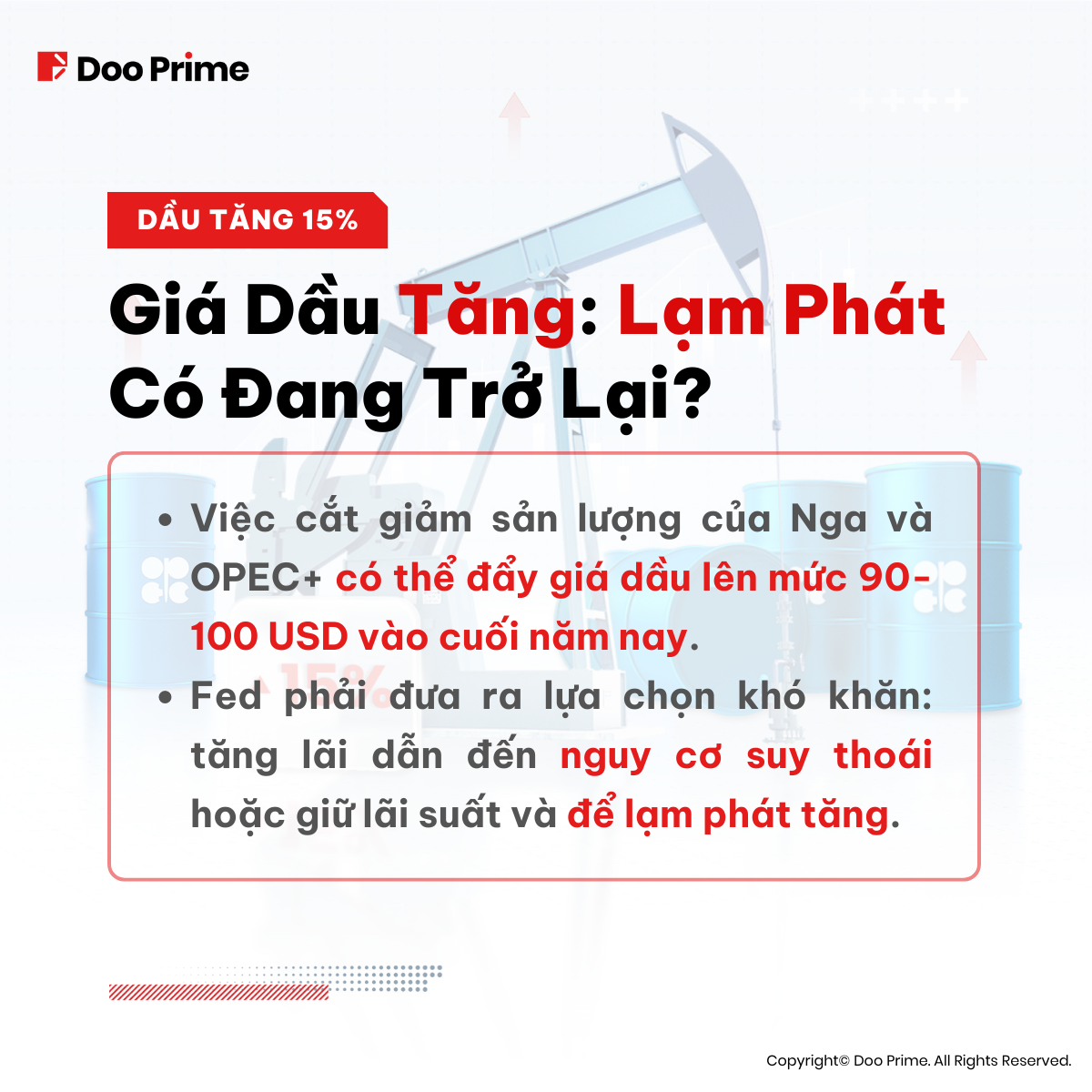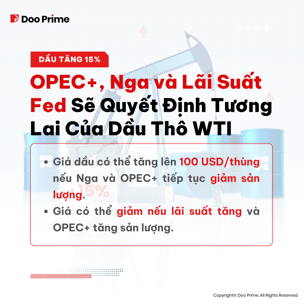 Thông tin này được gửi đến công chúng với mục đích duy nhất là cung cấp thông tin và không nên được xem là lời khuyên đầu tư, khuyến nghị, đề nghị hoặc sự chào mời mua hoặc bán bất kỳ công cụ tài chính nào. Thông tin hiển thị tại đây được chuẩn bị mà không có sự tham khảo hoặc cân nhắc đến bất kỳ mục tiêu đầu tư hoặc tình hình tài chính của cá nhân nào. Bất kỳ sự so sánh, tham khảo nào đối với hoạt động của một công cụ tài chính trong quá khứ hay chỉ số, hoặc một sản phẩm đầu tư sẽ không được xem là một chỉ số đáng tin cậy cho thấy kết quả trong tương lai của loại sản phẩm tài chính tương ứng. Doo Prime và công ty mẹ, các chi nhánh, công ty con, công ty liên kết, đối tác và nhân viên tương ứng, không đại diện hoặc đảm bảo đối với thông tin được hiển thị và sẽ không chịu trách nhiệm đối với bất kỳ tổn thất hoặc thiệt hại trực tiếp, gián tiếp, đặc biệt hoặc các hậu quả nào phát sinh từ bất kỳ thông tin không chính xác hoặc không đầy đủ nào được cung cấp và mọi rủi ro giao dịch trực tiếp hoặc gián tiếp, lãi hoặc lỗ phát sinh từ khoản đầu tư của bất kỳ cá nhân hoặc khách hàng nào.