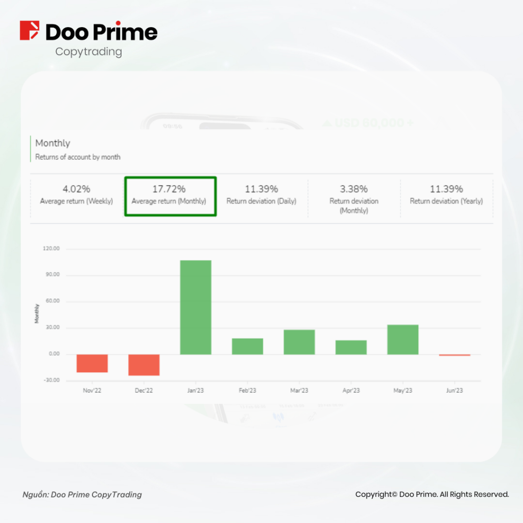 Sau hai tháng kể từ khi chính thức được thiết lập, tài khoản này đã nhanh chóng chuyển sang mức lợi nhuận dương, cũng như liên tục mang lại hơn 15% lợi nhuận mỗi tháng kể từ tháng 1 năm 2023. Đáng chú ý, tài khoản còn có khả năng duy trì mức lợi nhuận trung bình hằng tháng ấn tượng là 17.72%. Với tín hiệu đáng mừng trên, ta có thể đánh giá rằng đây là một nguồn lợi nhuận đáng tin cậy.