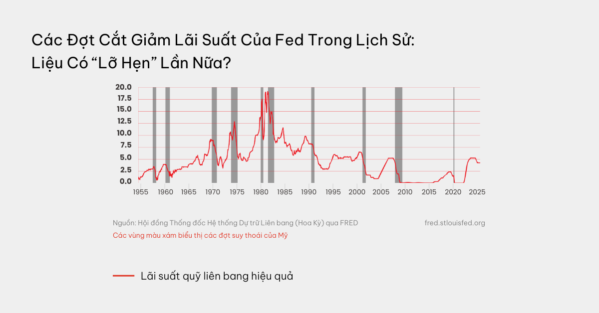 Biểu đồ dữ liệu kinh tế của Fed (FRED) về các chu kỳ lãi suất trước đó cho ta thấy: