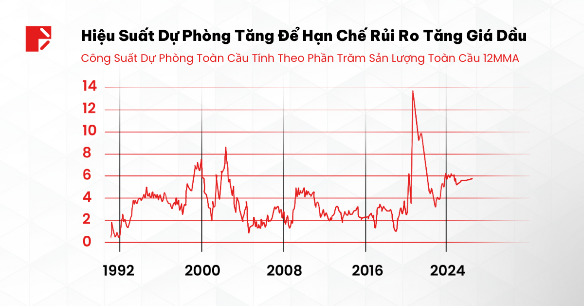 Biểu đồ trên minh họa năng lực sản xuất dự phòng toàn cầu vẫn tương đối cao. Dựa trên những yếu tố này, Goldman Sachs tin rằng dầu thô Brent sẽ được giới hạn ở mức 90 USD/thùng, không chịu ảnh hưởng bởi nguồn cung toàn cầu nữa. Điều này tạo lực cản đáng kể cho đà tăng của giá dầu.