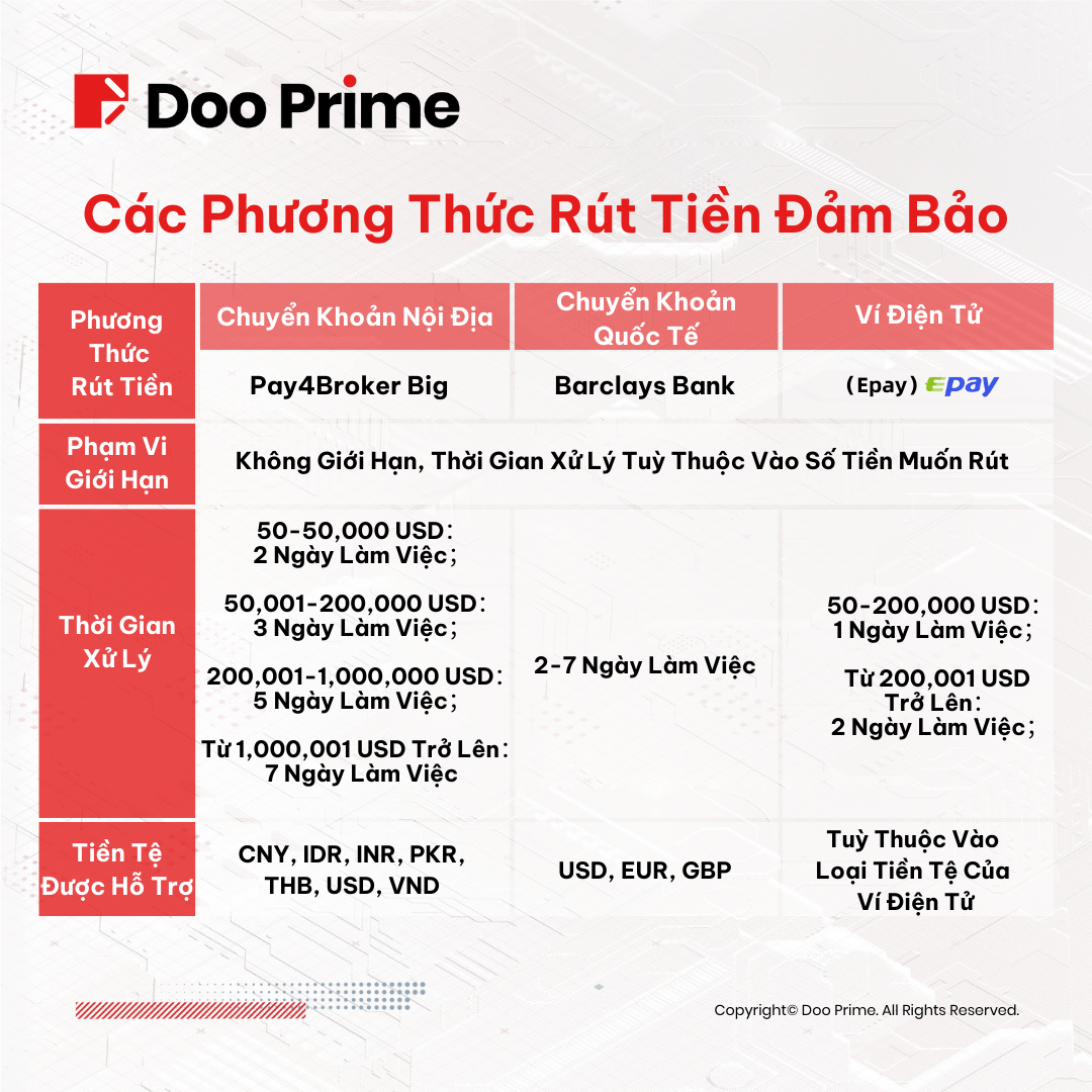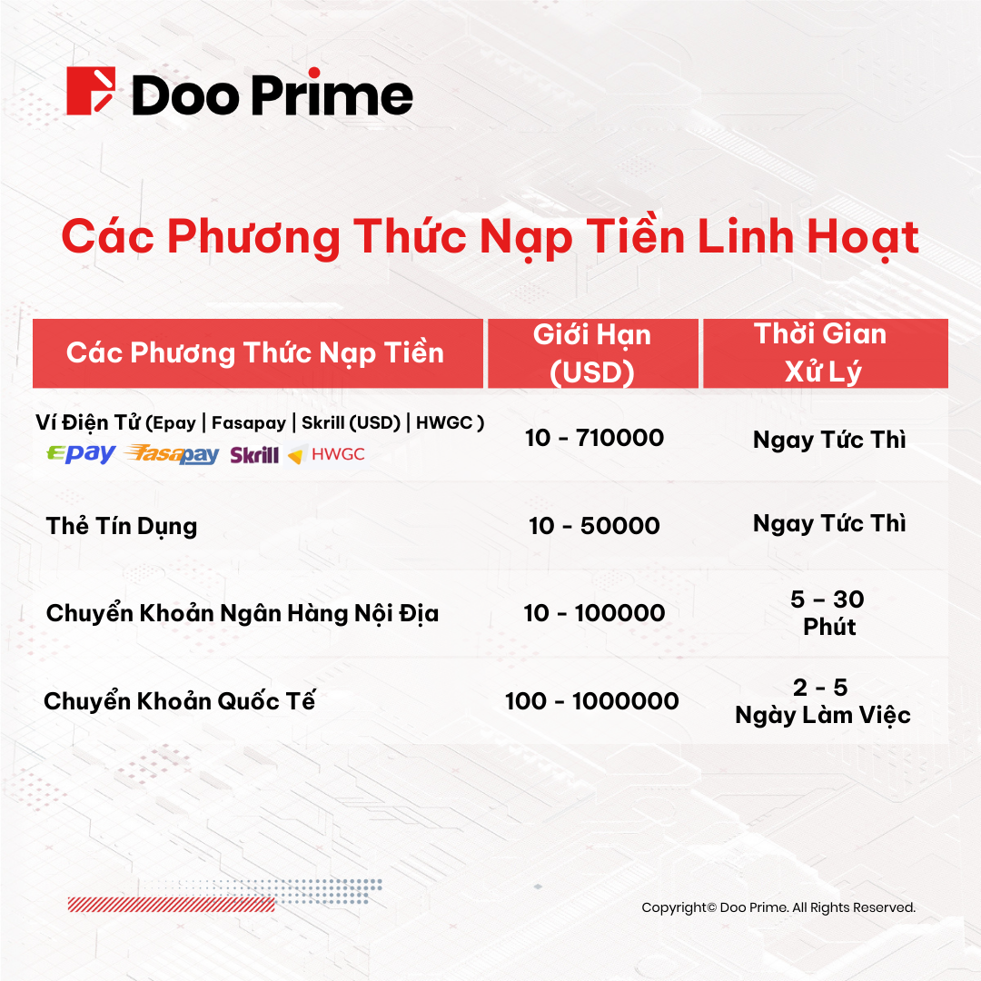 Tại Doo Prime, chúng tôi cung cấp nhiều phương thức nạp-rút tiền thuận tiện thông qua các kênh thanh toán như Chuyển Khoản Ngân Hàng Nội Địa, Chuyển Khoản Quốc Tế và Ví Điện Tử. Về cơ bản, Doo Prime hỗ trợ hơn 20 loại tiền tệ nhằm giải quyết kịp thời nhu cầu chuyển đổi tiền qua lại của các nhà đầu tư, từ đó mở rộng khả năng phân bổ vốn cho các danh mục đầu tư tương ứng.