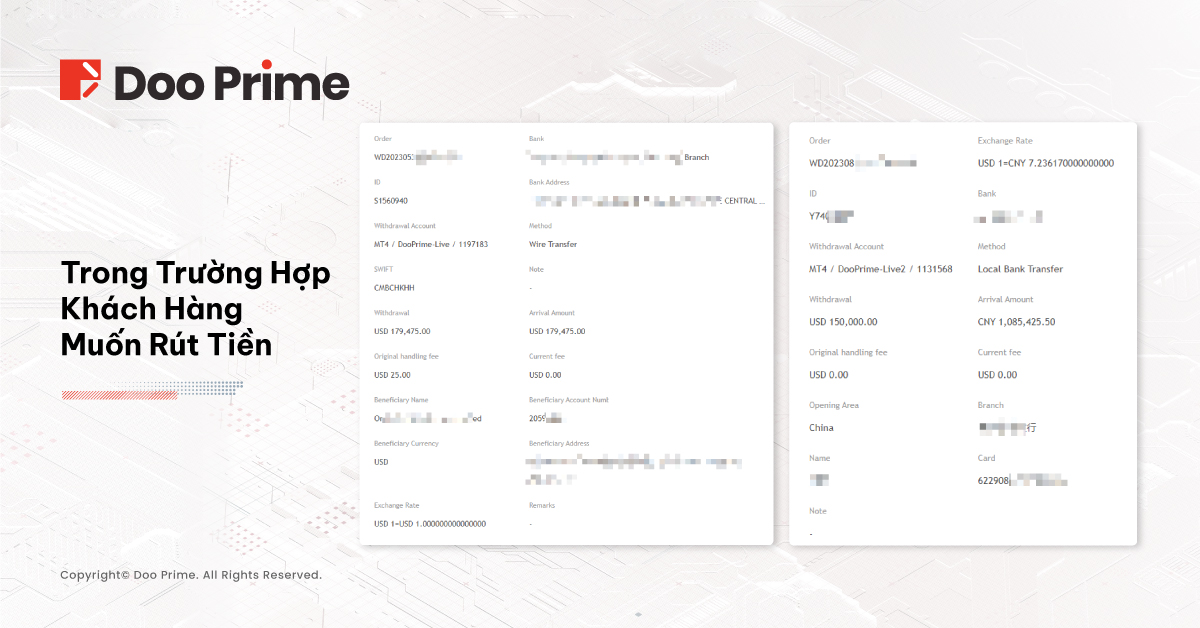Khách hàng tại Doo Prime có thể rút tiền thông qua các kênh thanh toán được đảm bảo của chúng tôi, trong đó có Chuyển Khoản Ngân Hàng Nội Địa, Chuyển Khoản Quốc Tế và Ví Điện Tử. Trong khoảng thời gian từ ngày 14 đến 25 tháng 8 năm 2023, Doo Prime đã xử lý tổng cộng 8,337 lệnh rút tiền từ phía khách hàng, tương đương với tổng số tiền 21,586,960.34 USD.