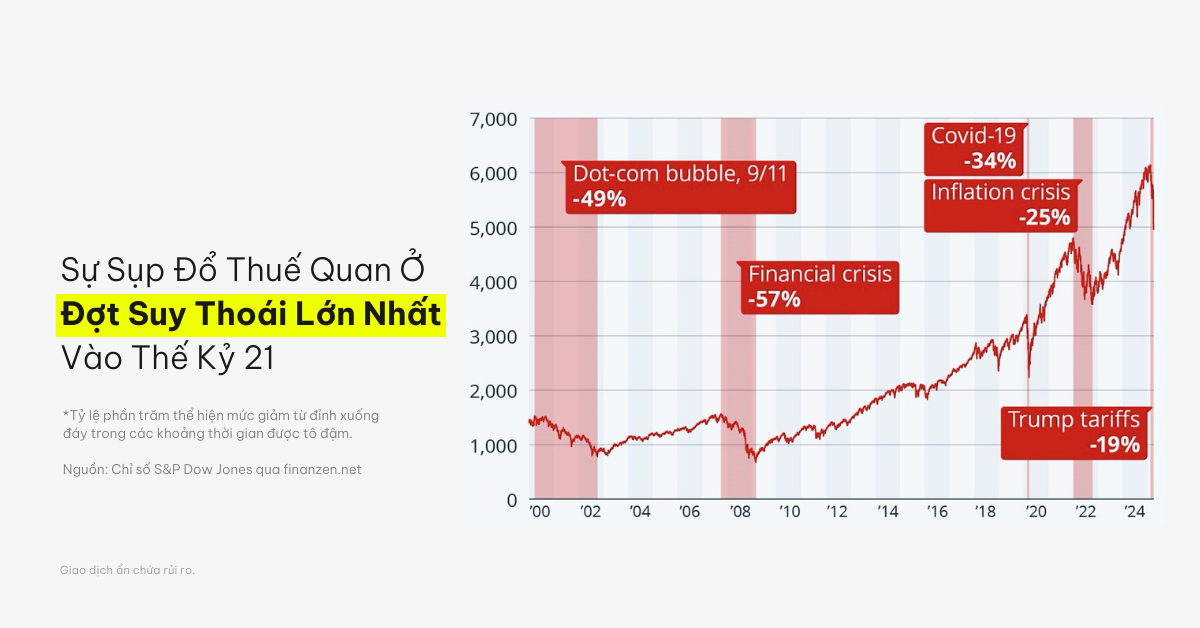 Trong làn sóng thuế quan đầu tiên dưới thời ông Trump, chỉ số S&P 500 đã giảm gần 20% tại thời điểm mạnh mẽ nhất của đợt điều chỉnh. Động thái này không xuất phát nhiều từ thiệt hại kinh tế ngay tức thì, mà chủ yếu do sự gia tăng bất định xoay quanh chuỗi cung ứng, lạm phát và tăng trưởng trên toàn cầu.