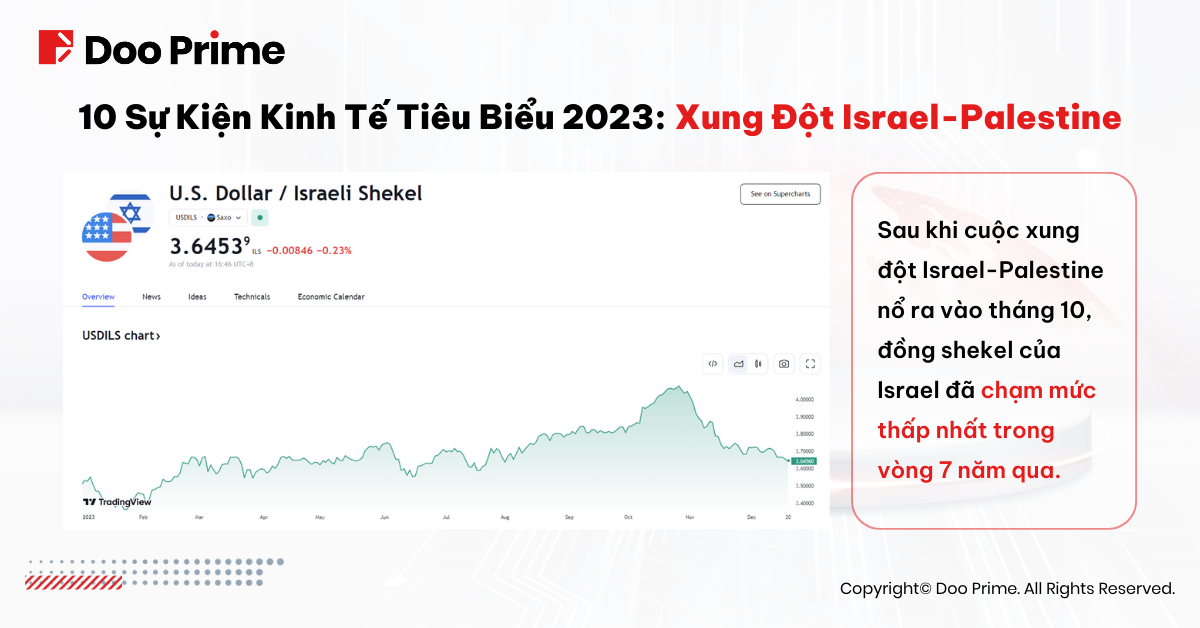 Sự kiện tồi tệ nhất của năm 2023 đích thị là xung đột leo thang giữa Israel và Palestine hồi tháng 10. Căng thẳng địa chính đã đẩy đồng shekel của Israel chạm mức thấp nhất trong vòng 7 năm qua. Thêm đó, vàng, loại tài sản trú ẩn an toàn phổ biến nhất, đã tăng phi mã trong ngắn hạn. Nhà đầu tư cũng đặt kỳ vọng rất lớn vào dầu, khiến giá dầu đã có lúc chạm đỉnh 95 USD một thùng.