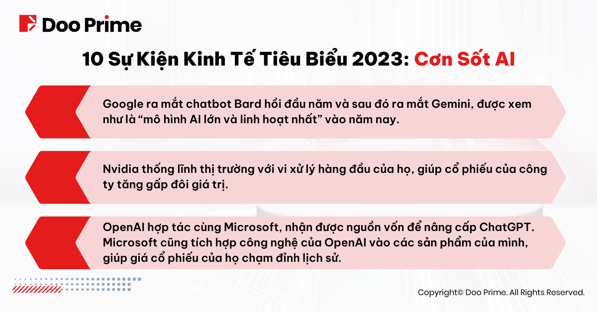 Kể từ khi ChatGPT ra mắt vào cuối năm 2022, làn sóng AI đã càn quét mọi thị trường trên thế giới. Các ông lớn công nghệ đầu tư mạnh mẽ để tham gia cuộc đua về AI. Cổ phiếu liên quan đến AI tăng phi mã.
