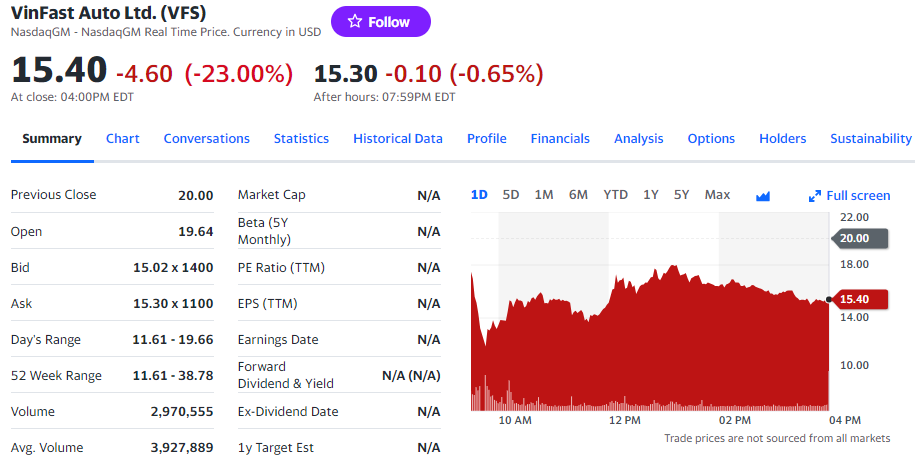 Khép phiên 18/08, cổ phiếu VinFast giảm hơn 23% về 15.40 USD/cp trên sàn Nasdaq, tức lao dốc 58.5% so với mức đóng cửa của phiên đầu giao dịch (37.11 USD/cp). Kéo theo đó, vốn hóa cũng giảm về 35 tỷ USD.
