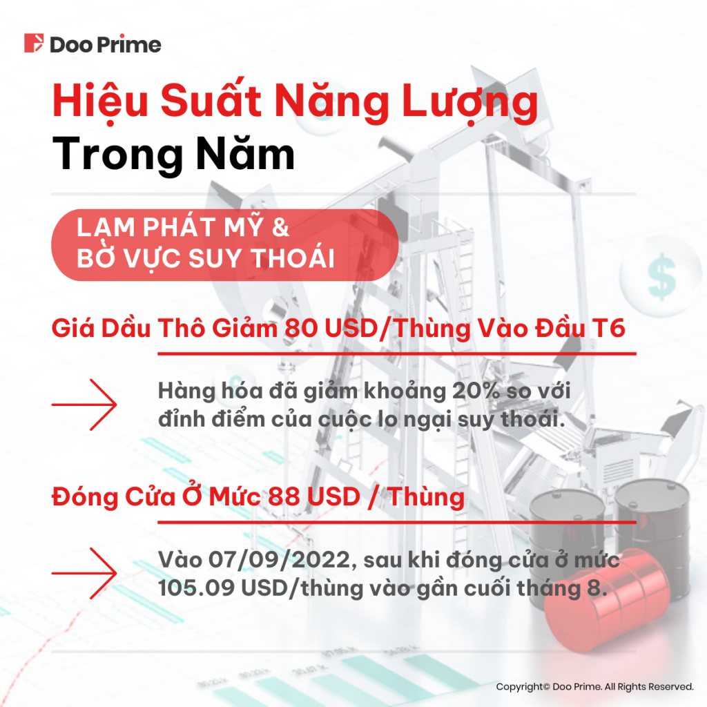 Cuối cùng, không thể không kể đến giá dầu toàn cầu – vốn đã tăng vọt trong vòng nửa đầu năm – chính thức giảm mạnh do lo ngại rằng suy thoái kinh tế toàn cầu sẽ làm giảm nhu cầu. Riêng dầu thô Brent cũng đã giảm 20% kể từ cuối tháng Sáu. Tiêu chuẩn toàn cầu đạt mức cao nhất là 139 USD/thùng vào tháng 3 sau khi Nga tiến bước vào lãnh thổ của Ukraine.